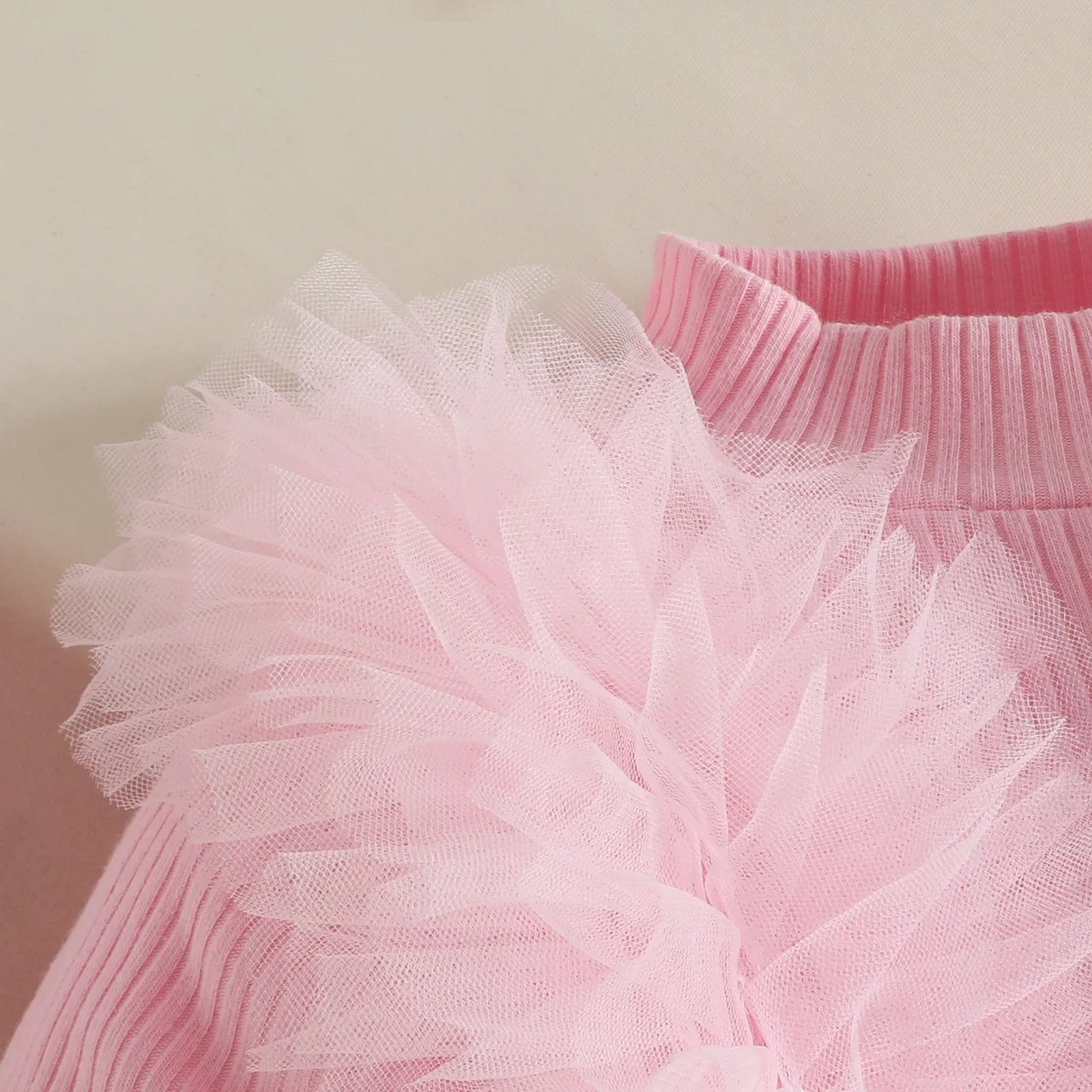 Tulle Trim 2Pcs Sets 0-3Y Baby Dresses Long Sleeve Top and Button Accent Skirt for Newborn Girls Party Outfit