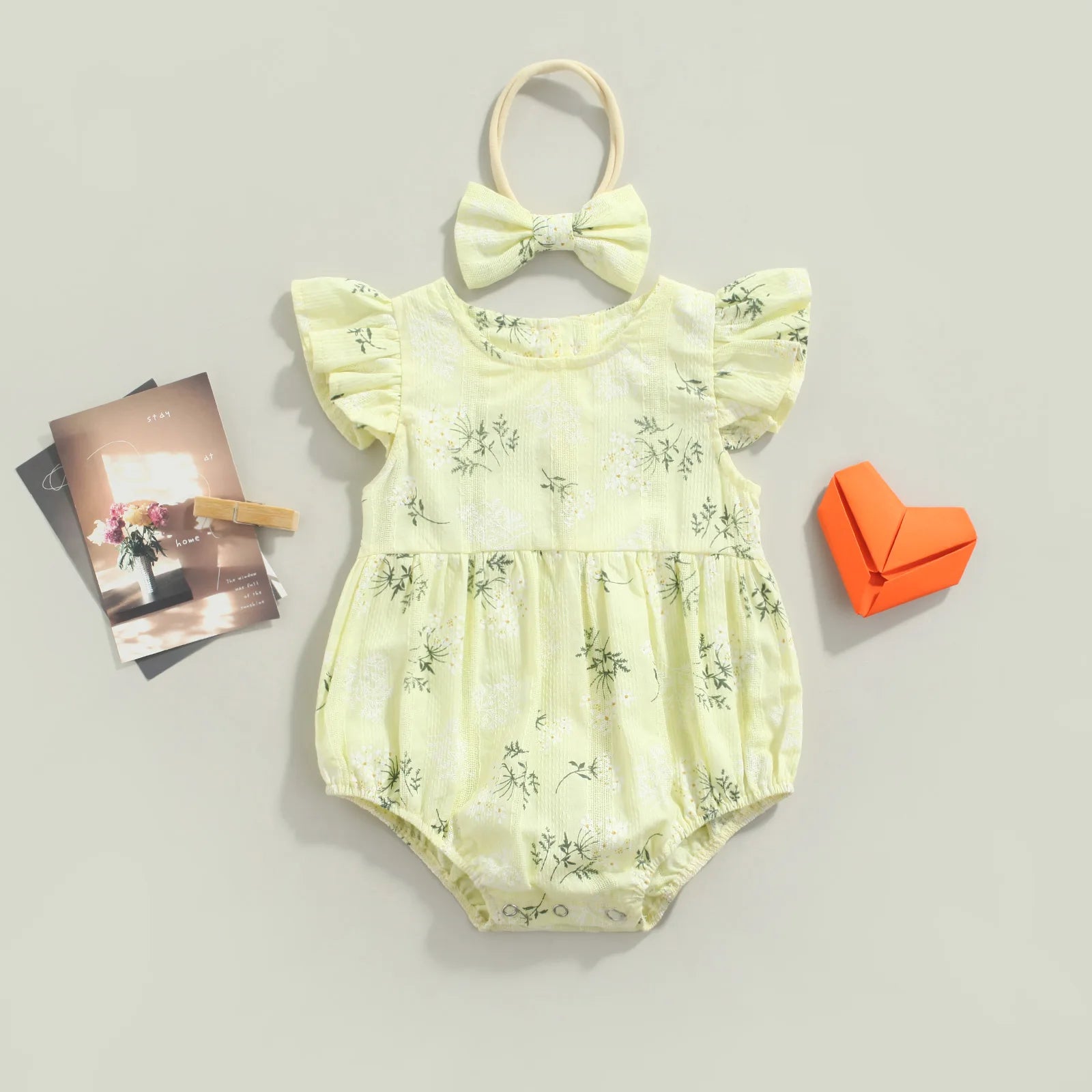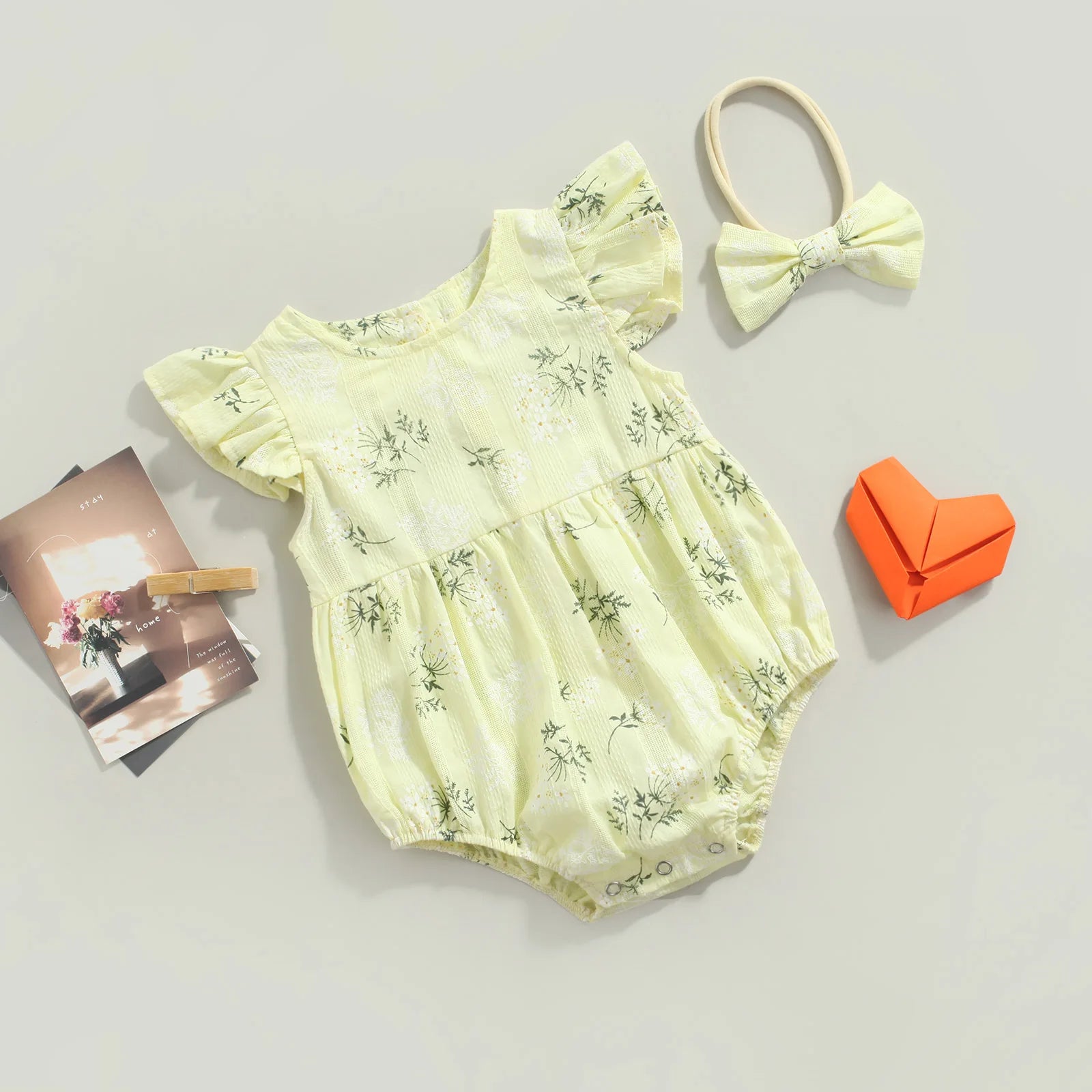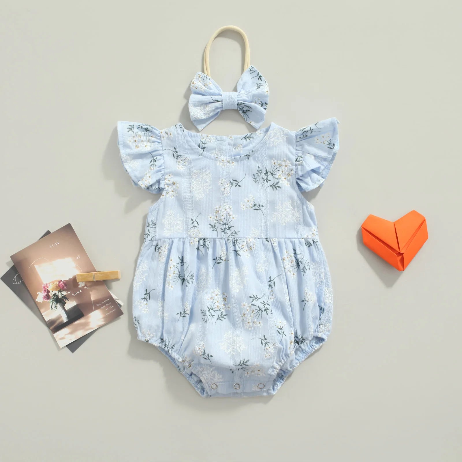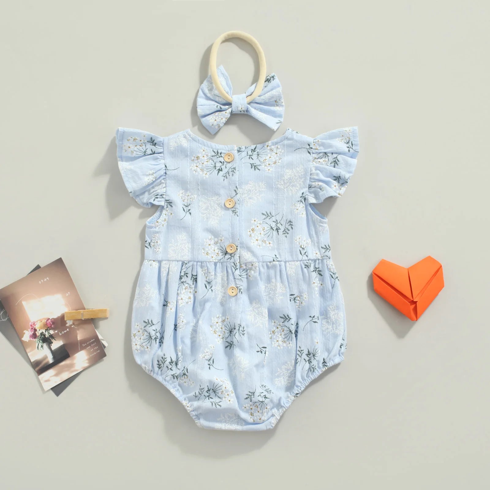 Baby Romper with Hairband Kids Floral Print Round Neck Fly Sleeve Bodysuit+ Headband for Summer Blue/Yellow 0-24 Months