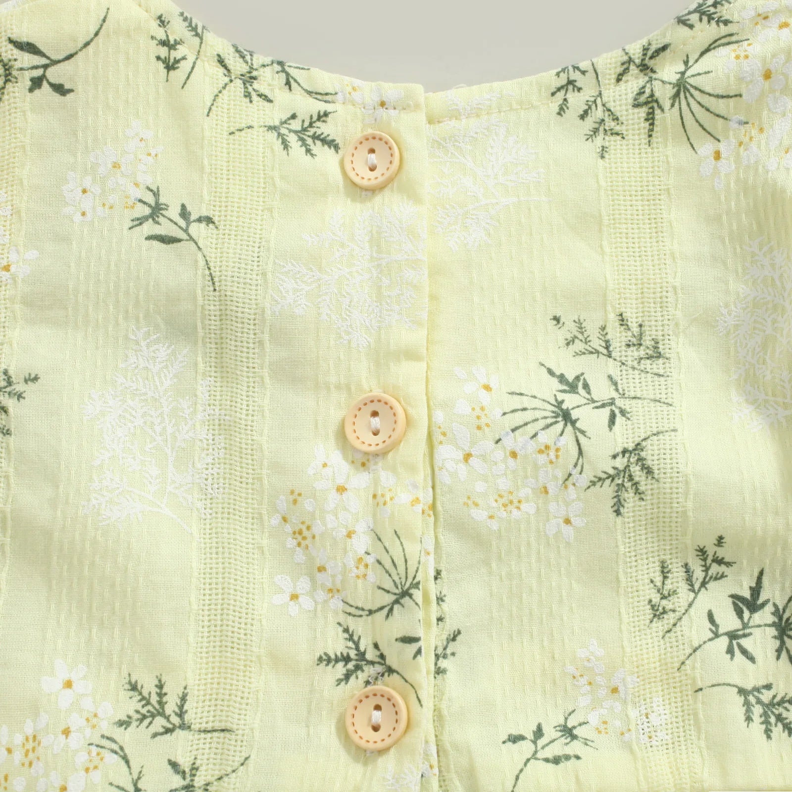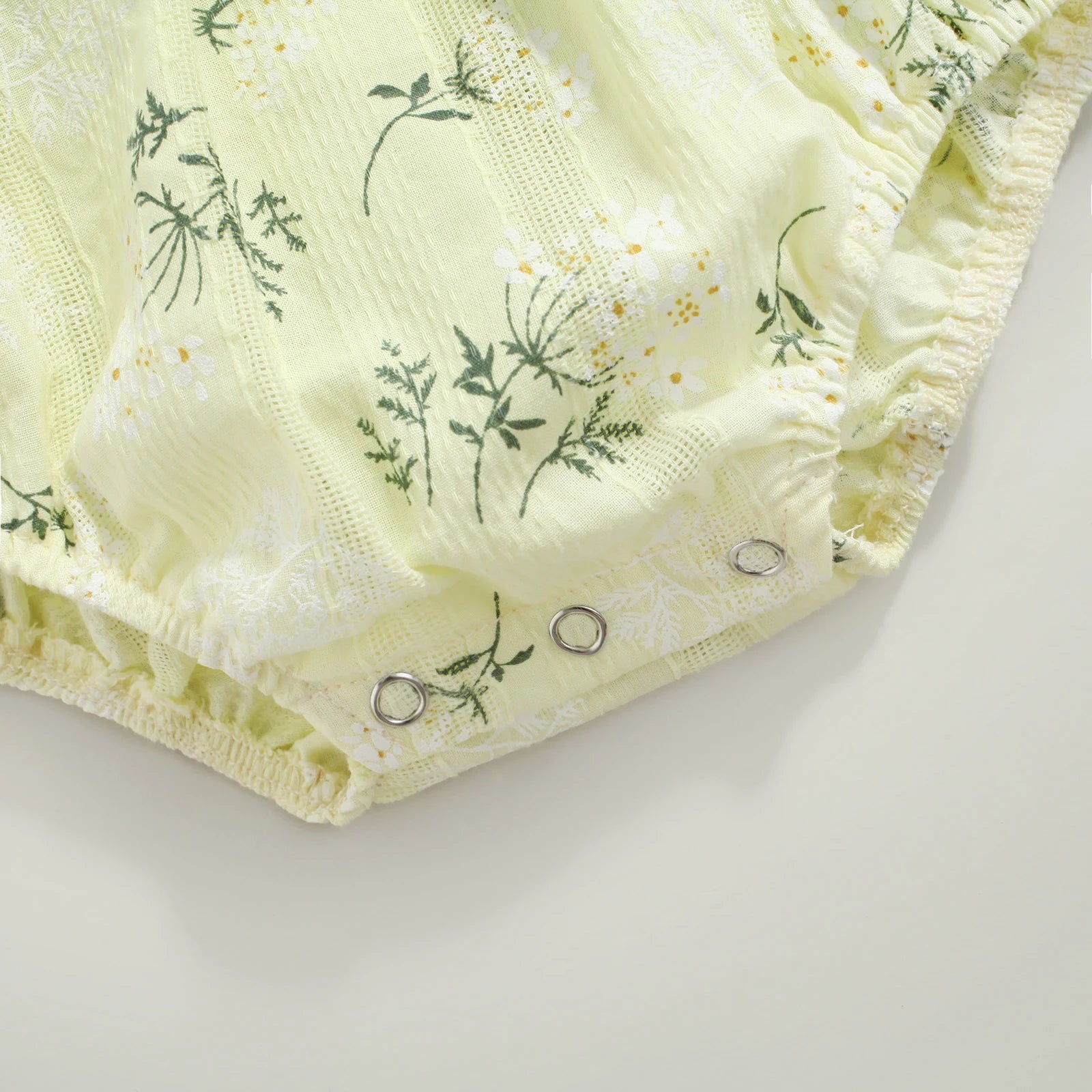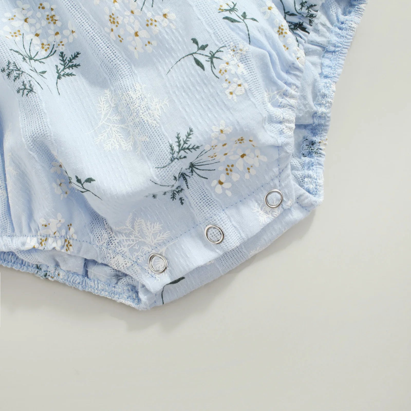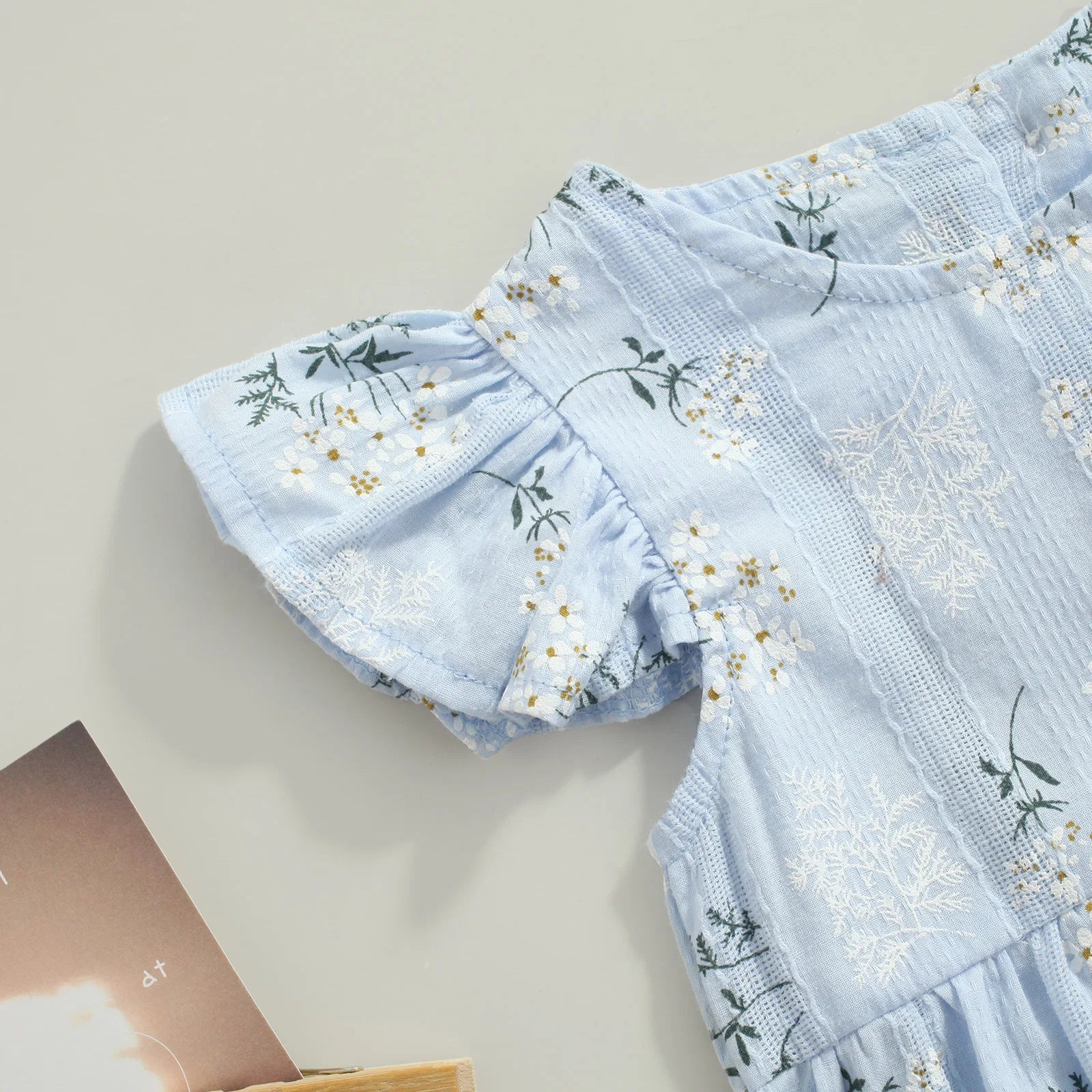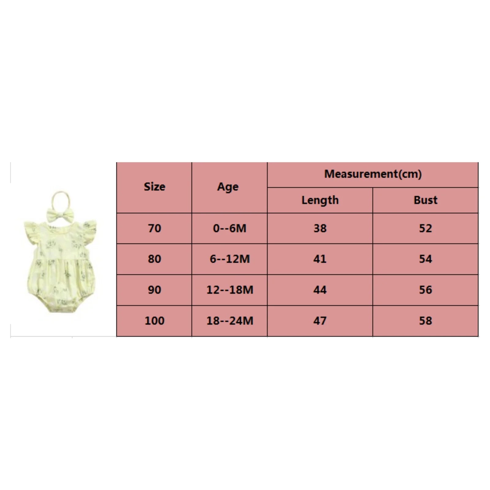 Baby Romper with Hairband Kids Floral Print Round Neck Fly Sleeve Bodysuit+ Headband for Summer Blue/Yellow 0-24 Months