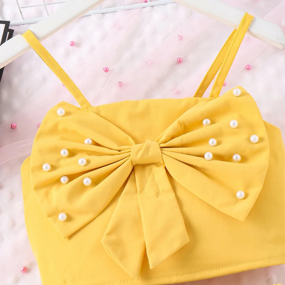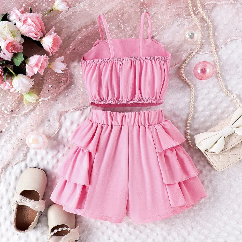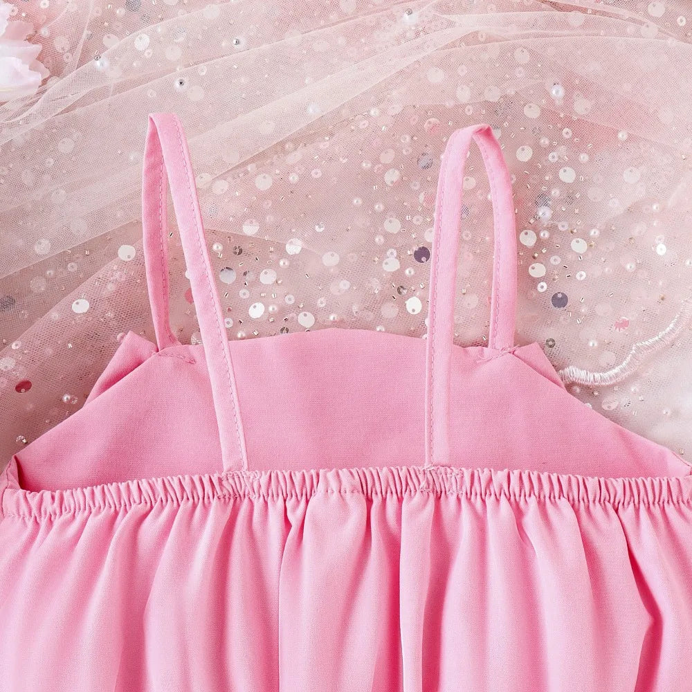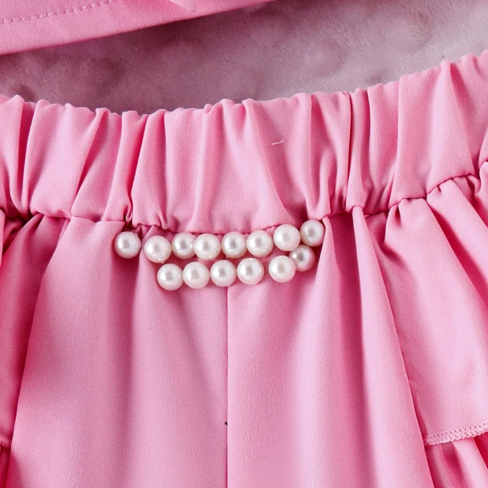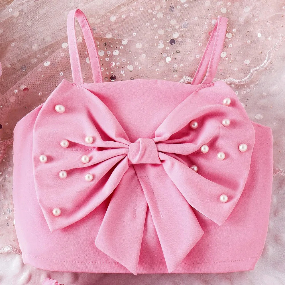 Bear Leader Summer New Pink Girls Clothes Sweet and Cute Children's Suit Pearl Bow Decorative Strap Top+Cake Skirt 2-piece Set
