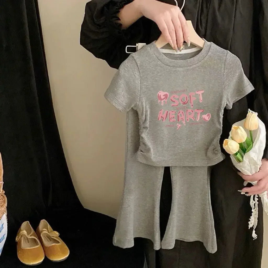 Children's Sets Girls' Summer Sweetheart Print Blouse Set - Waist-Cinching Top + Flared Pants Two Piece Set