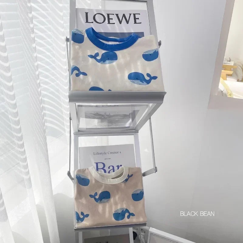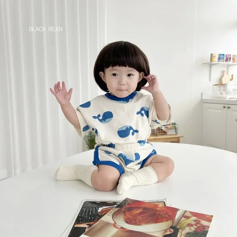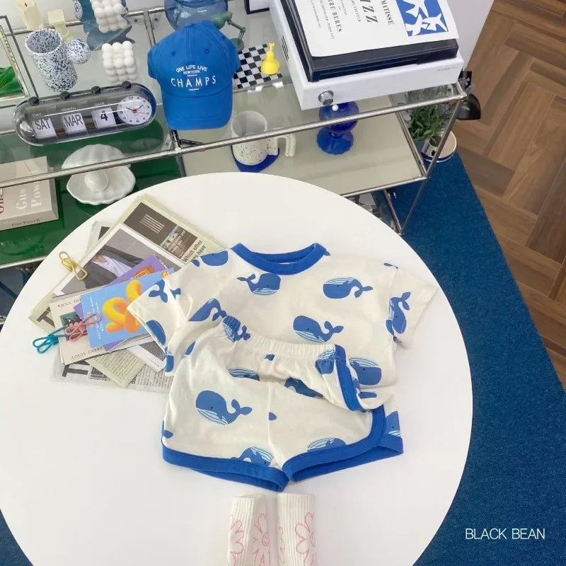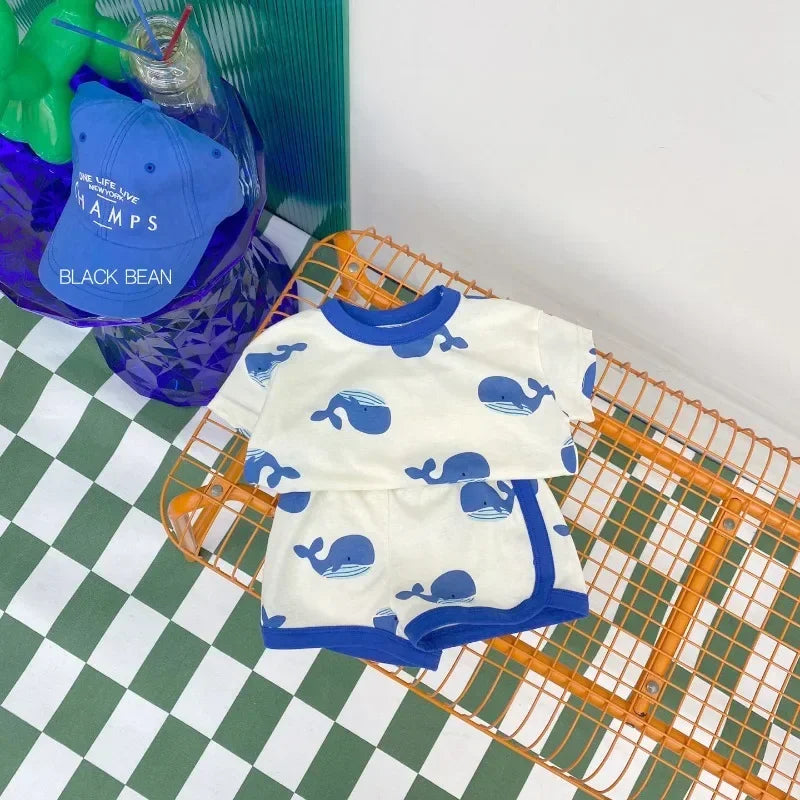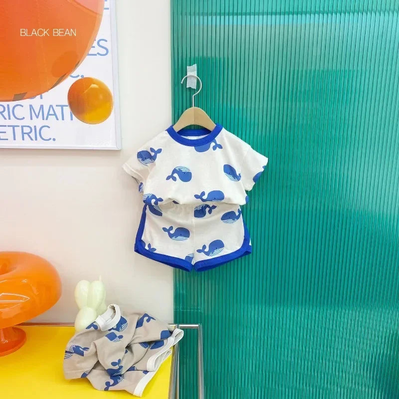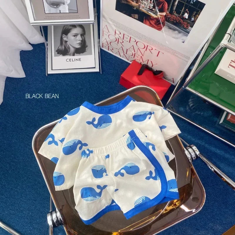 Full Print dolphin Tees +shorts Boys And Girls Cute Cotton Fashion Crew Neck Pullover Short Sleeve Home Clothes 2pcs Suits