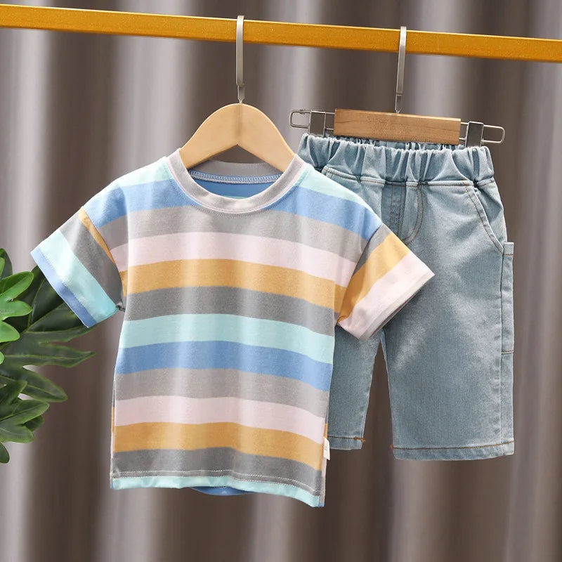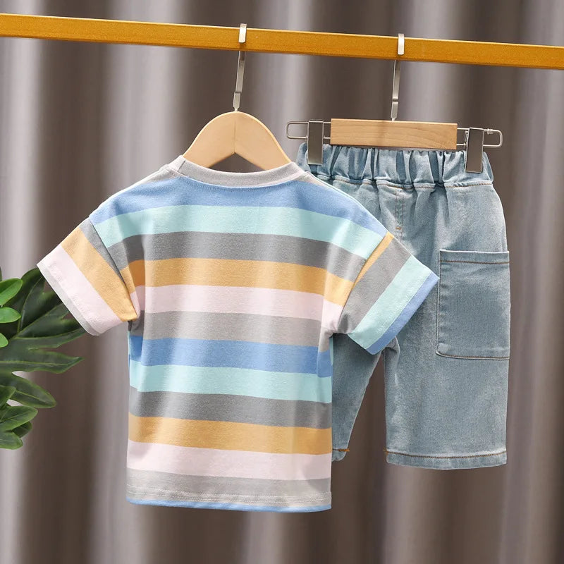 Summer Baby Boys Clothes Suit Fashion Tshirt Toddler Boy Outfit Set Stripe Shirt+Denim Shorts 2 Pcs Sets Infants Kids Clothes