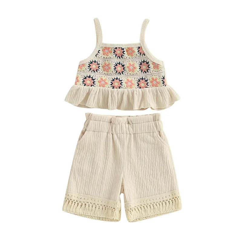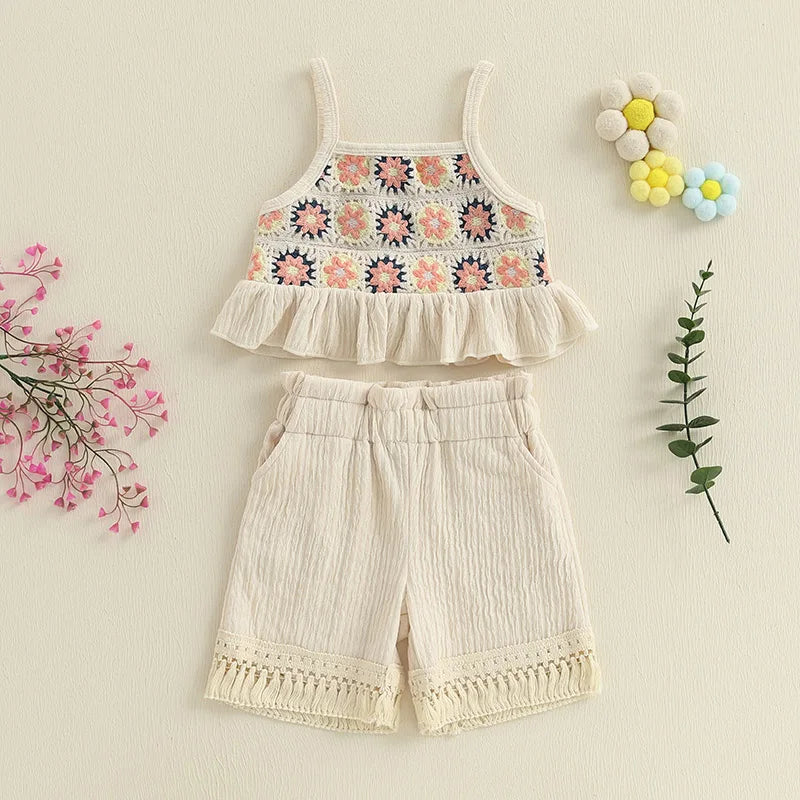 Summer Girls Clothing Sets Floral Design Ruffled Trim Sleeveless Tank Tops and Tassel Shorts Baby Clothes Children Kids Outfits